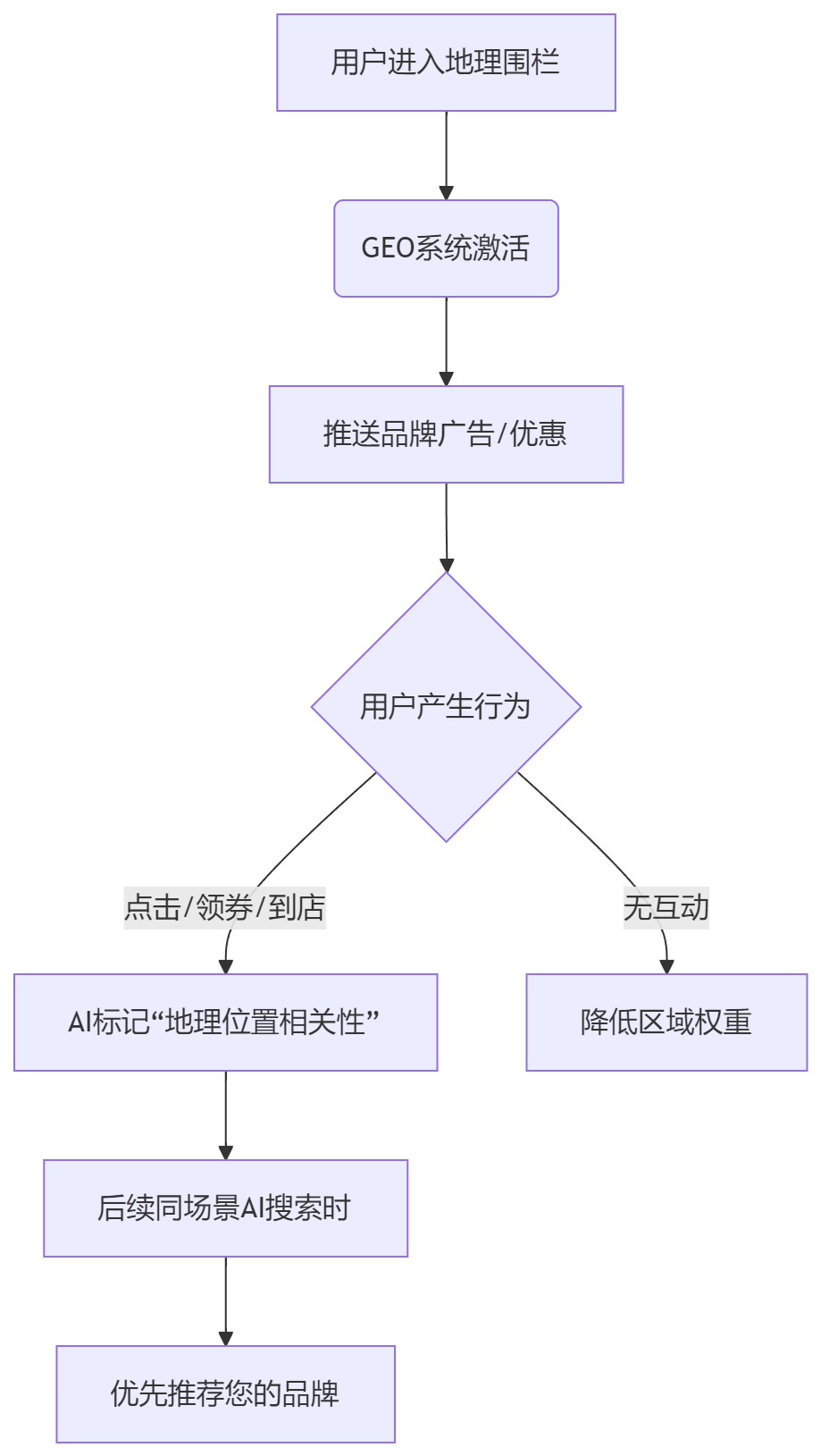 | 训练推荐算法偏好 | 地理围栏内用户互动后,追加AI信息流再营销(例:推送门店打卡攻略) | 同类场景推荐率↑ 65% |